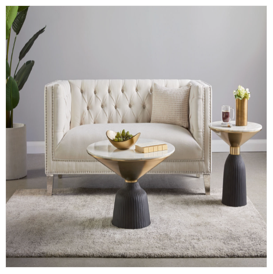 Meet The Martin Collection – where sophistication meets modern design. This collection features an end table and a coffee table with luxurious marble tops, elegant gold accents, and sleek black bases. The natural veining of the marble adds timeless beauty, while the gold accents and black bases create a harmonious blend of classic and contemporary aesthetics.